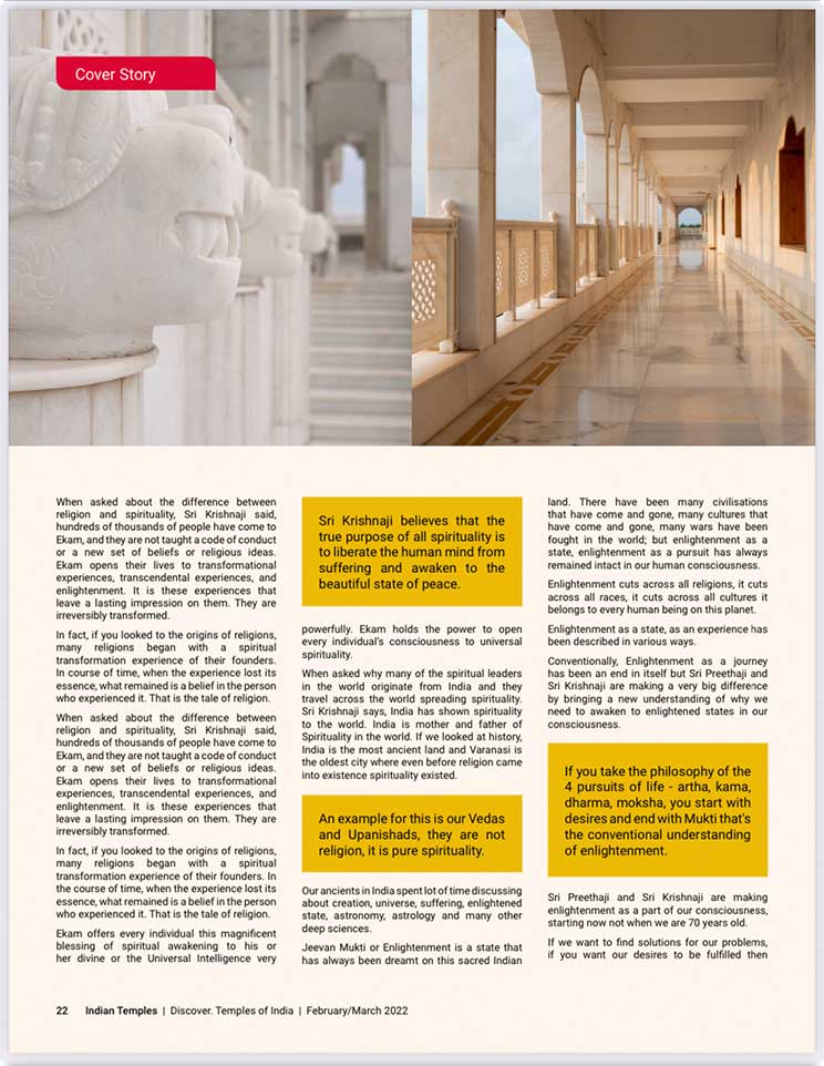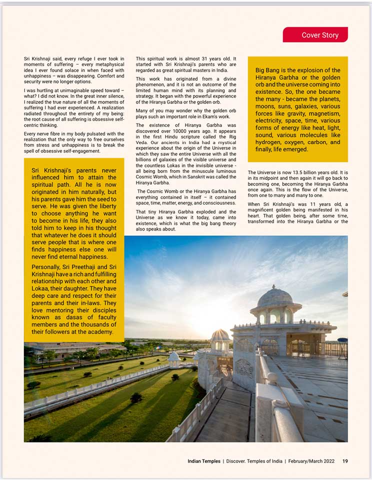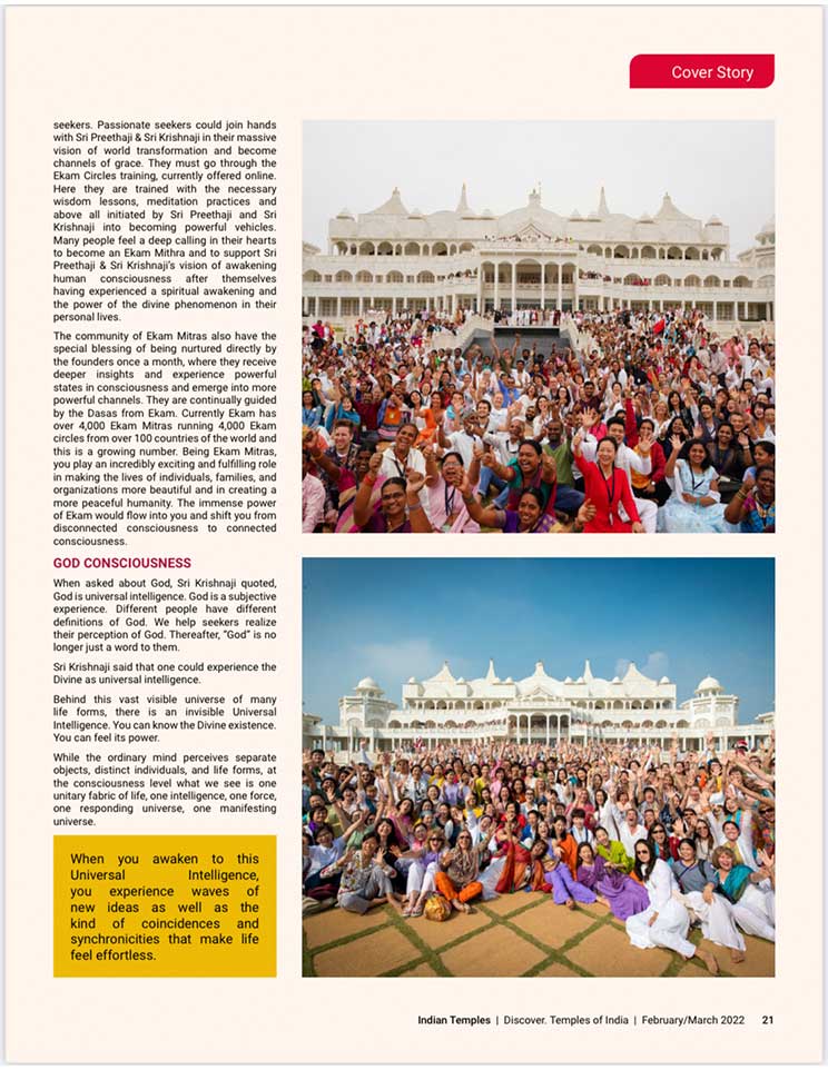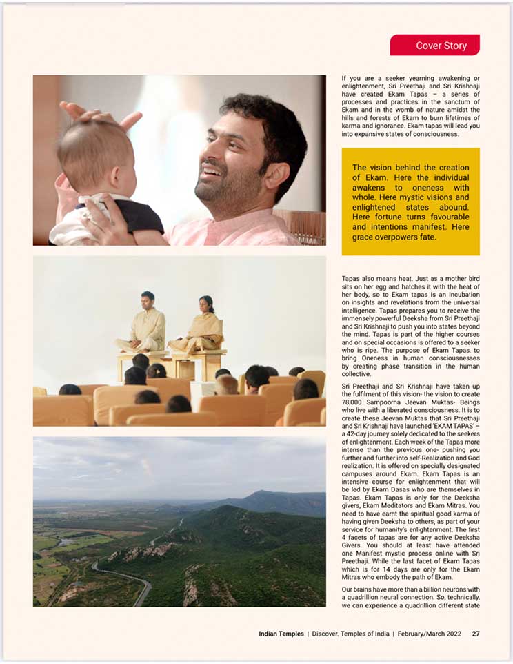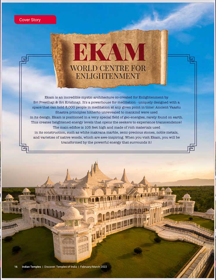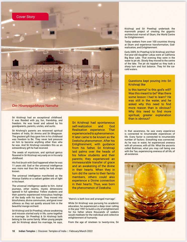 スピリチュアル雑誌、『Indian Temples(インドの寺院)』のカバーストーリーに掲載されました。エーカムつまり覚醒のためのビジョンを持つことで最も尊敬されているシュリ・プリタジとシュリ・クリシュナジは、大変敬意を払われ、幅広く読まれているスピリチュアル雑誌『Indian Temples(インドの寺院)』の20ページに渡り掲載されました。