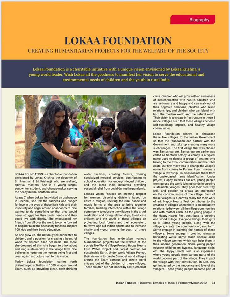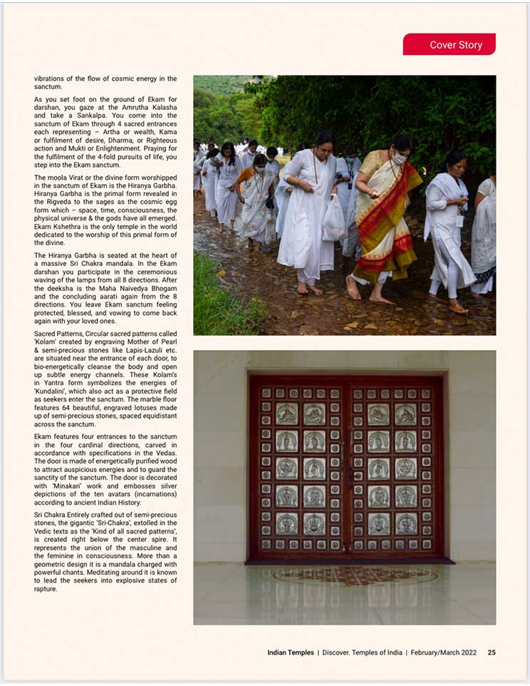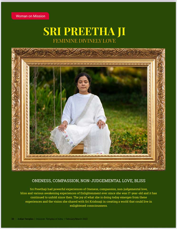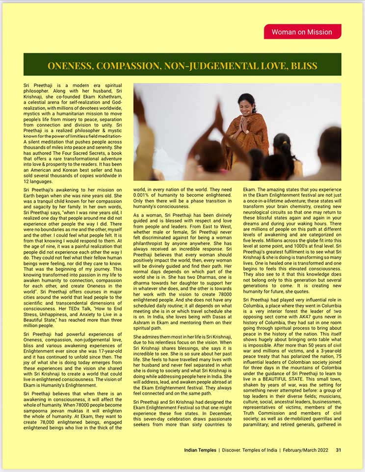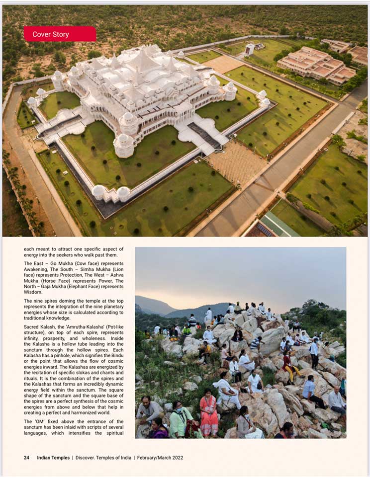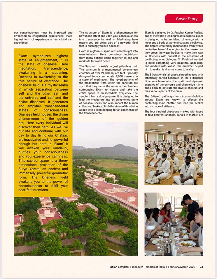 スピリチュアル雑誌、『Indian Temples(インドの寺院)』のカバーストーリーに掲載されました。エーカムつまり覚醒のためのビジョンを持つことで最も尊敬されているシュリ・プリタジとシュリ・クリシュナジは、大変敬意を払われ、幅広く読まれているスピリチュアル雑誌『Indian Temples(インドの寺院)』の20ページに渡り掲載されました。